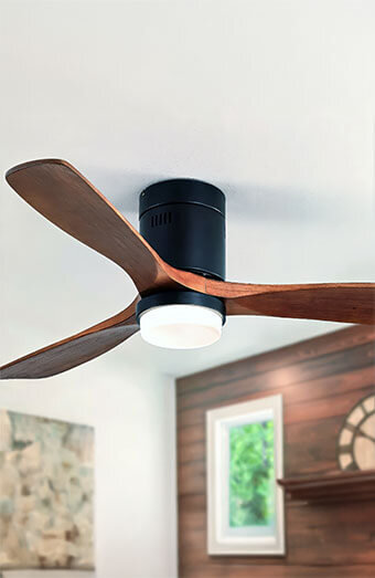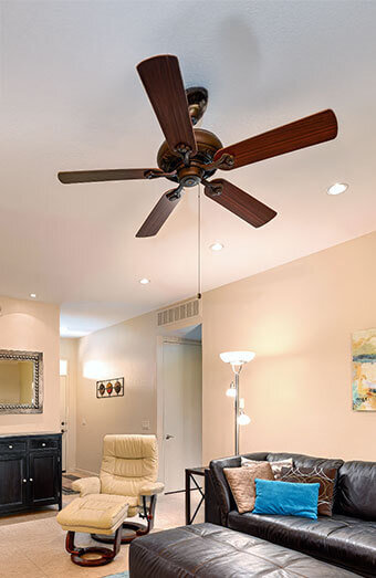 Professional installation of new ceiling fans in bedrooms, living rooms, patios and offices with options including standard fans and modern low-profile designs.
